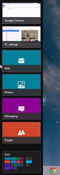 اگر به صورت همزمان چندین نرم افزار و یا پنجره در حال اجرا باشند، با قرار دادن شکلک ماوس بر روی گوشه سمت چپ بالای تصویر میتوانید تصویر کوچکی از همه پنجره ها را ببینید. ای کار را با زدن کلید های ترکیبی Win +Tab نیز میتوانید انجام دهید. حالا از روی تصویرهای کوچک نمایش داده شده، بر روی پنجره مورد نظر خود کلیک کنید تا به آن منتقل شوید. این کار با کلید های ترکیبی Alt+Tab نیز قابل انجام است.